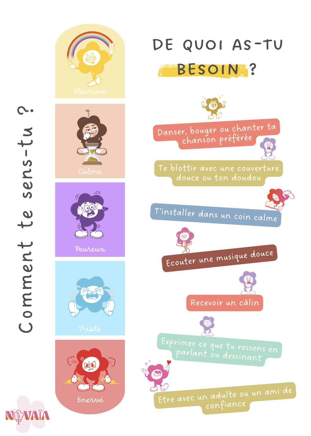 Cette affiche aide l’enfant à faire le lien entre ce qu’il ressent et ce qui pourrait l’aider à se sentir mieux. Elle invite à passer de la simple reconnaissance de l’émotion à l’action concrète, adaptée à son état émotionnel.